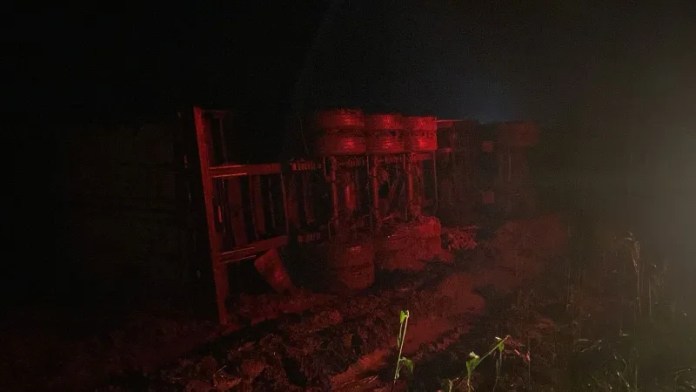 Uma que transportava uma carga de carne tombou na rodovia PA-150, próximo à vila Bom jesus, zona rural de Tailândia, nordeste paraense. O caso ocorreu na terça-feira (09).