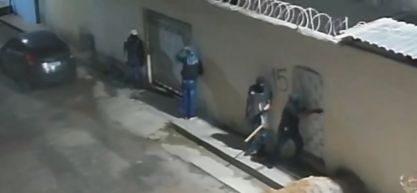 Nas imagens, é possível ver um carro preto chegando ao local, de onde desceram os suspeitos que, encapuzados, tentaram arrombar o portão de entrada.