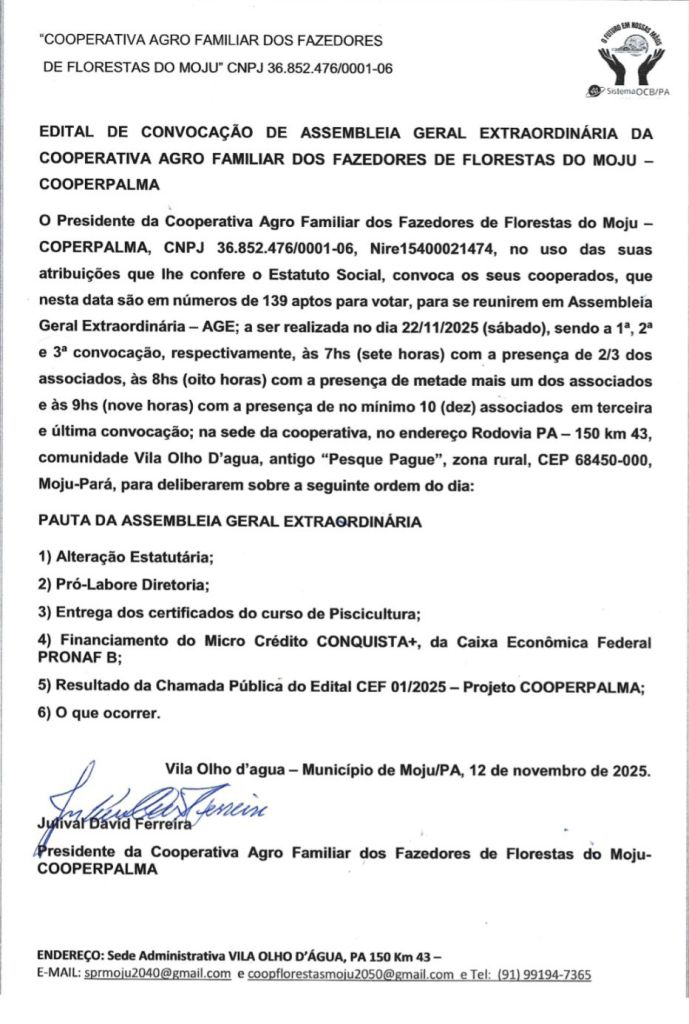 Moju EDITAL DE CONVOCAÇÃO DE ASSEMBLEIA GERAL EXTRAORDINÁRIA DACOOPERATIVA AGRO FAMILIAR DOS FAZEDORES DE FLORESTAS DO MOJU -COOPERPALMA Por Moju News - novembro 12, 2025 FacebookWhatsAppXPinterestTelegram Moju News Compartilhe isso: Compartilhar no Facebook(abre em nova janela) Facebook Compartilhar no X(abre em nova janela) 18+