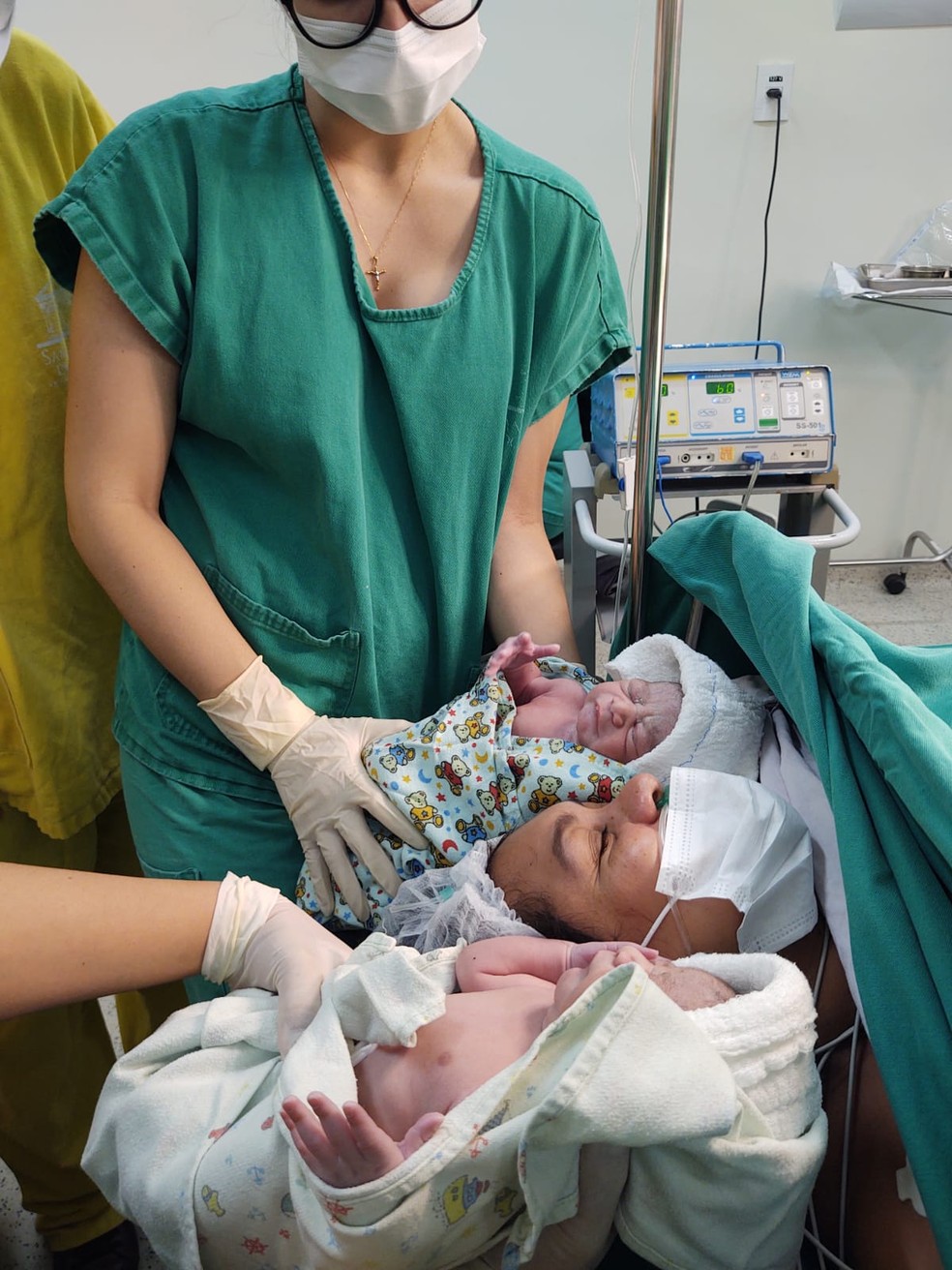 Bolsa foi rompida pelo pai dos bebês, que acompanhou o parto. Em caso de gêmeos, o fenômeno é considerado mais raro ainda, dizem especialistas.