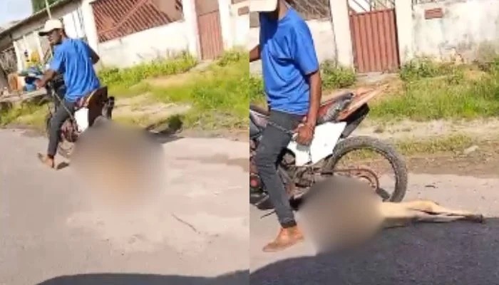 Segundo relatos, o animal já estava machucado e sem forças para se levantar, sendo submetido a sofrimento extremo enquanto era arrastado pela via pública. A cena causou indignação entre moradores, que intervieram imediatamente para impedir a continuidade do ato violento.
