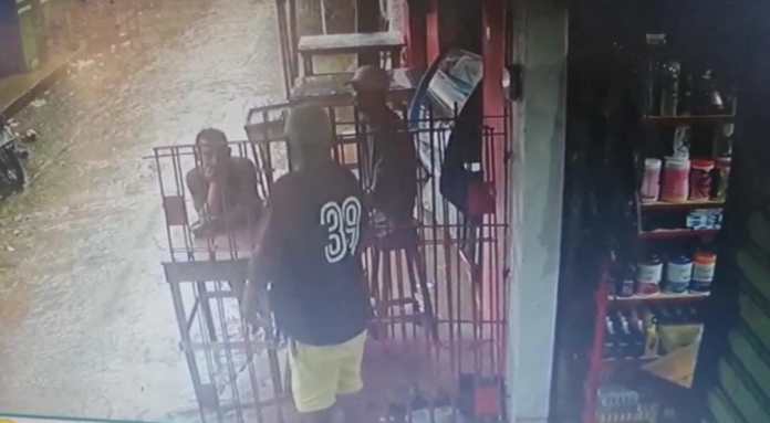 Câmera de segurança de um supermercado em Moju, no centro comercial da cidade, registrou o momento em que dois homens saem na porrada.