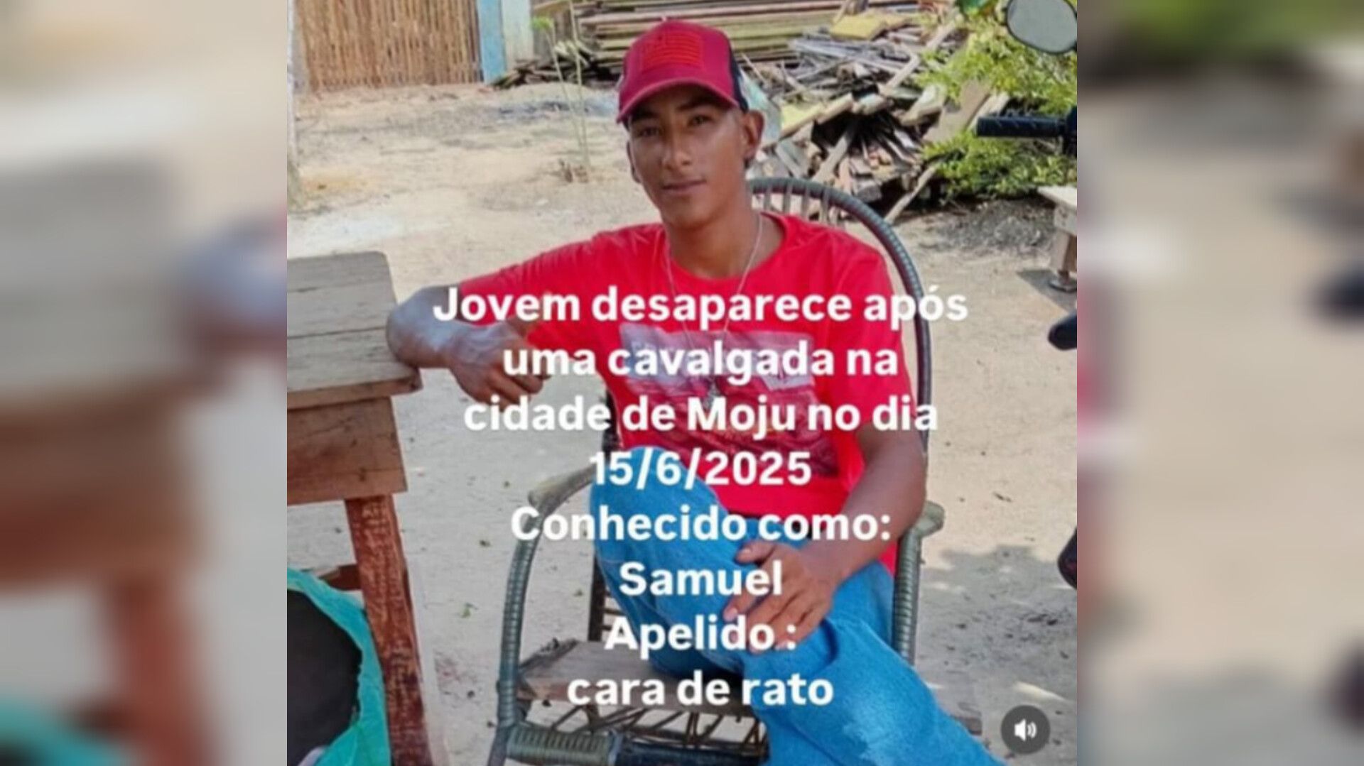 Na tarde de domingo (15), Samuel Mendes, mais conhecido na região como “Cara de Rato”, desapareceu após participar de uma cavalgada em Moju. A falta de informações sobre seu paradeiro gerou grande preocupação entre familiares, amigos e a comunidade local. O jovem, que é popular na cidade, não foi visto desde que participou do evento, e seu desaparecimento tem chamado a atenção nas redes sociais e nos grupos de WhatsApp da região.