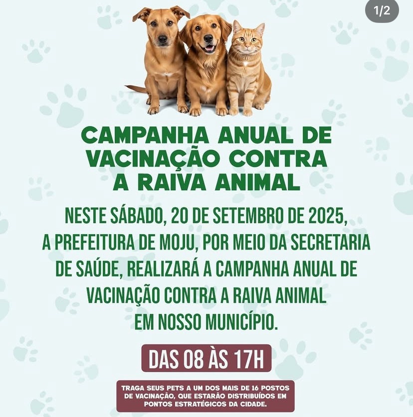 A Prefeitura de Moju, por meio da Secretaria Municipal de Saúde, realiza neste sábado, 20 de setembro de 2025, a Campanha Anual de Vacinação contra a Raiva Animal. A ação acontecerá das 8h às 17h, em mais de 16 postos de vacinação distribuídos estrategicamente pela cidade.