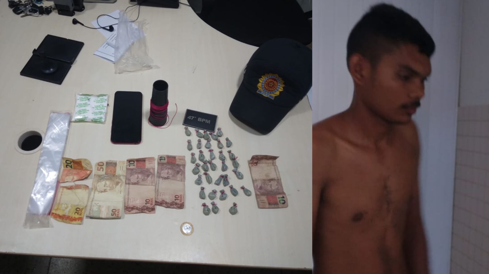 O suspeito foi identificado como Lucinei Maia Góes, que foi avistado pela PM, na Vila Limoeiro, em atitude suspeita. Após revista no bolso do suspeito, foi encontrada a droga e materiais para a produção do entorpercente.