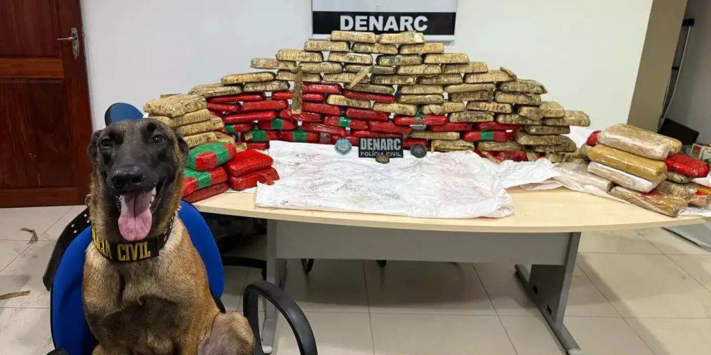 Com o auxílio da cadela farejadora Kyra, os policiais iniciaram as buscas. Embora inicialmente nada tenha sido localizado dentro da casa, o animal indicou um ponto em um terreno próximo, onde foram encontrados sacos contendo tabletes de substâncias semelhantes ao oxi e à maconha.