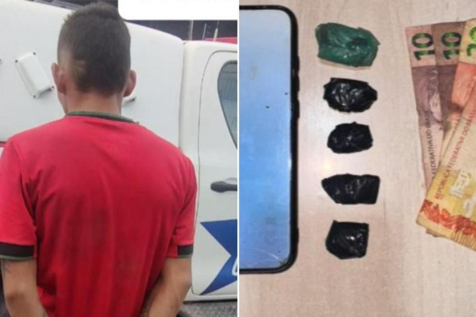 Durante a revista pessoal, foram encontrados com ele cinco invólucros plásticos contendo substância semelhante à maconha, R$ 60 em espécie e um celular da marca Xiaomi.