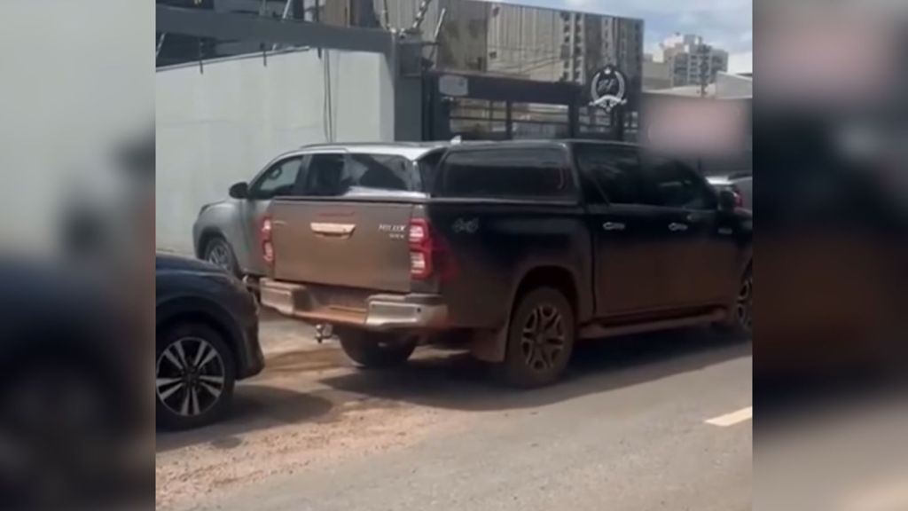 Uma cena chamou a atenção nesta terça-feira (17), em Cuiabá. Em imagens gravadas, é possível ver o momento em que o condutor de uma SW4 prata não gostou de encontrar uma Toyota Hilux estacionada, bloqueando a saída de uma garagem.